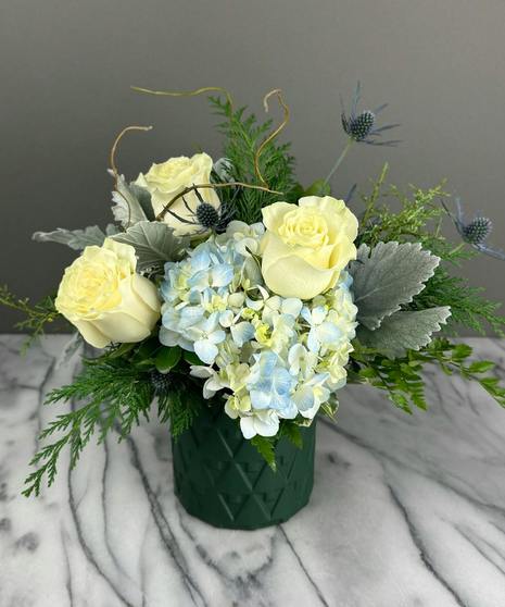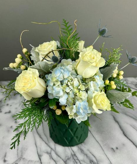 Bring the serene beauty of the Arctic into your home with our Arctic Circle Centerpiece. This elegant design features soft white roses, delicate blue hydrangeas, silvery dusty miller, and striking thistle, accented with lush seasonal greenery for a frosty, winter-inspired look. Arranged in a chic emerald green vase, this centerpiece is perfect for holiday tables, winter gatherings, or gifting to someone special. For a more dramatic display, you can upgrade your Arctic Circle Centerpiece to include additional blooms. Handcrafted with care, this arrangement captures the tranquility and beauty of a snowy winter’s day.