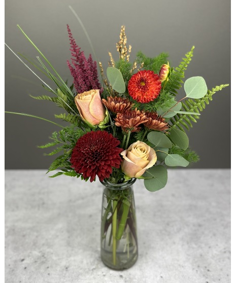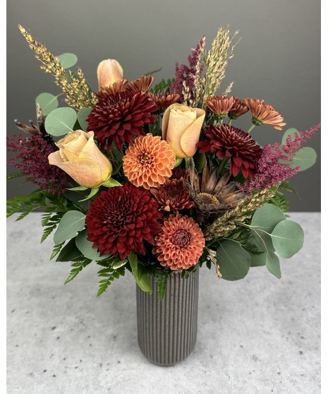 Our Autumn – Designer’s Mix arrangement is a lush seasonal tribute to fall’s natural beauty. Bursting with golden sunflowers, warm rustic roses, rich burgundy accents, and touches of local greenery, this design captures the cozy, vibrant spirit of autumn. Each arrangement is hand-designed with similar flowers and a warm harvest-inspired color palette, though exact blooms may vary with seasonal availability.
