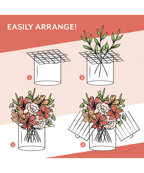 Just place the grid on top of your vase, insert your flowers, and let the supportive structure guide each stem exactly where it belongs. Once your design is complete, simply separate the two interlocking pieces and gently remove the grid, leaving behind a perfectly balanced arrangement.