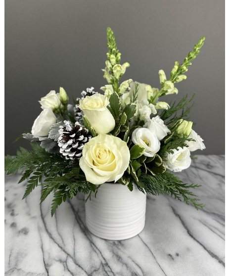 Capture the crisp elegance of the season with our First Frost Centerpiece. This charming arrangement features creamy white roses, delicate lisianthus, and soft snapdragons, paired with frosted pinecones, seasonal greenery, and touches of silvery foliage for a wintry look. Designed in a compact, textured white vase, this centerpiece is perfect for intimate gatherings, gifting, or adding a touch of seasonal charm to smaller spaces. Part of our Frost Collection, the First Frost Centerpiece evokes the serene beauty of the season’s first frost, bringing timeless elegance to your holiday celebrations.