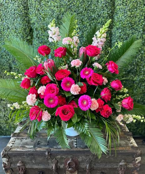 Our Rosé Urn arrangement is a radiant and graceful floral tribute, crafted to surround a cherished urn or to stand alone as a statement of soft remembrance. Designed with an array of lush pink blooms, this piece embodies warmth, love, and tender memories, perfect for honoring someone who brought light and grace to those around them.