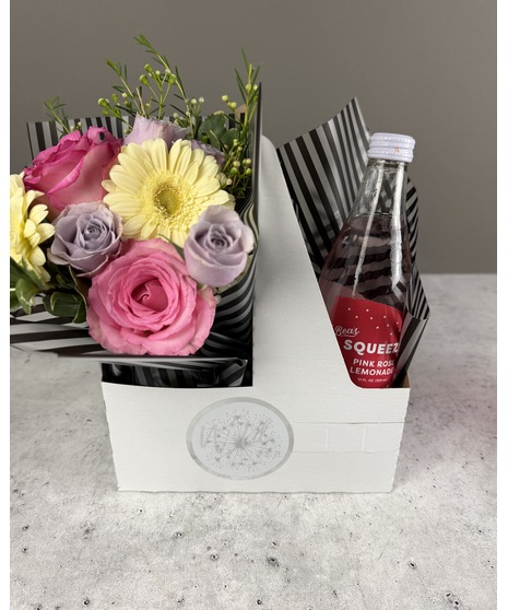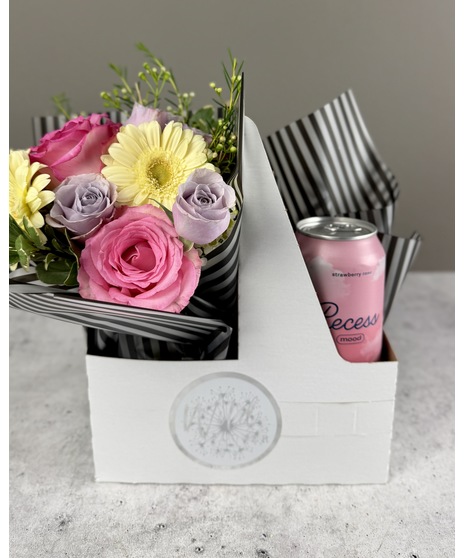 Elevate your gift-giving with our Sip & Bloom arrangement, a perfect pairing of lush florals and indulgent treats. This thoughtfully designed arrangement features a vibrant collection of seasonal blooms nestled in a stylish caddy, accompanied by your choice of a delightful add-on:
