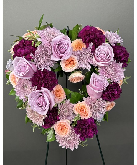 Celebrate a life of love and tenderness with our Sweetness Heart Wreath, a stunning open-center heart wreath filled with a soft and elegant mix of pink and purple flowers, accented with lush greenery. The delicate hues symbolize affection, grace, and remembrance, offering a meaningful and heartfelt tribute for any occasion. Displayed on a standing easel, the Sweetness Heart Wreath creates a graceful and loving expression of devotion. While flowers may vary with the seasons, the color palette of pinks and purples will remain the same. A ribbon can also be added for a personalized touch at an additional fee.