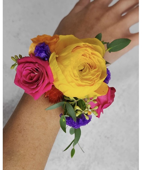 Introduce a burst of lively charm to your special occasions with our Vibrant Corsage. This modern accessory is not defined by specific flowers but by its dynamic color palette, featuring bold shades of color and touches of green on a cuff band. Perfect for proms, weddings, or any festive event, this corsage is designed to stand out and add a contemporary twist to traditional floral accessories.