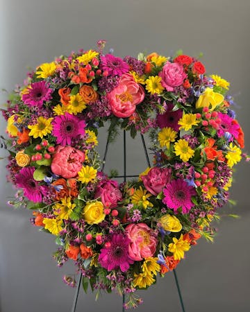 Celebrate a life filled with love, passion, and vibrant memories with our Vibrant Heart Wreath. Designed in the shape of a heart, this sympathy piece is a radiant expression of affection and remembrance. Crafted with seasonal blooms in bold, joyful tones—think rich reds, brilliant oranges, vivid pinks, and sunny yellows—this arrangement captures the spirit of someone who lived life colorfully.