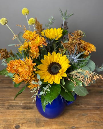 A celebration of Van Gogh's "Sunflowers" or just a gorgeous array of goldeny blooms in a ceramic vase, our "Vincent" arrangement will bring a smile to any one! Including mixed varieties of sunflowers and other yellow accent blooms such as rudbeckia, craspedia, yarrow and more!