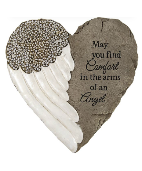 Beautifully crafted in the shape of a heart, this keepsake features a sculpted angel wing paired with the touching inscription: “May you find comfort in the arms of an angel.” Its weather-resistant design makes it suitable for display in a garden, memorial site, or as a comforting piece indoors.