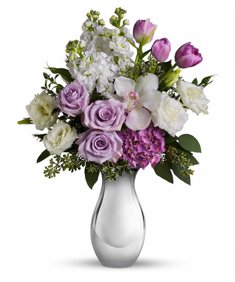 When we say it will leave her breathless, we're not exaggerating. She'll be swept away by the lush lavender roses, white orchid and other fabulous favorites in a Silver Reflections vase.